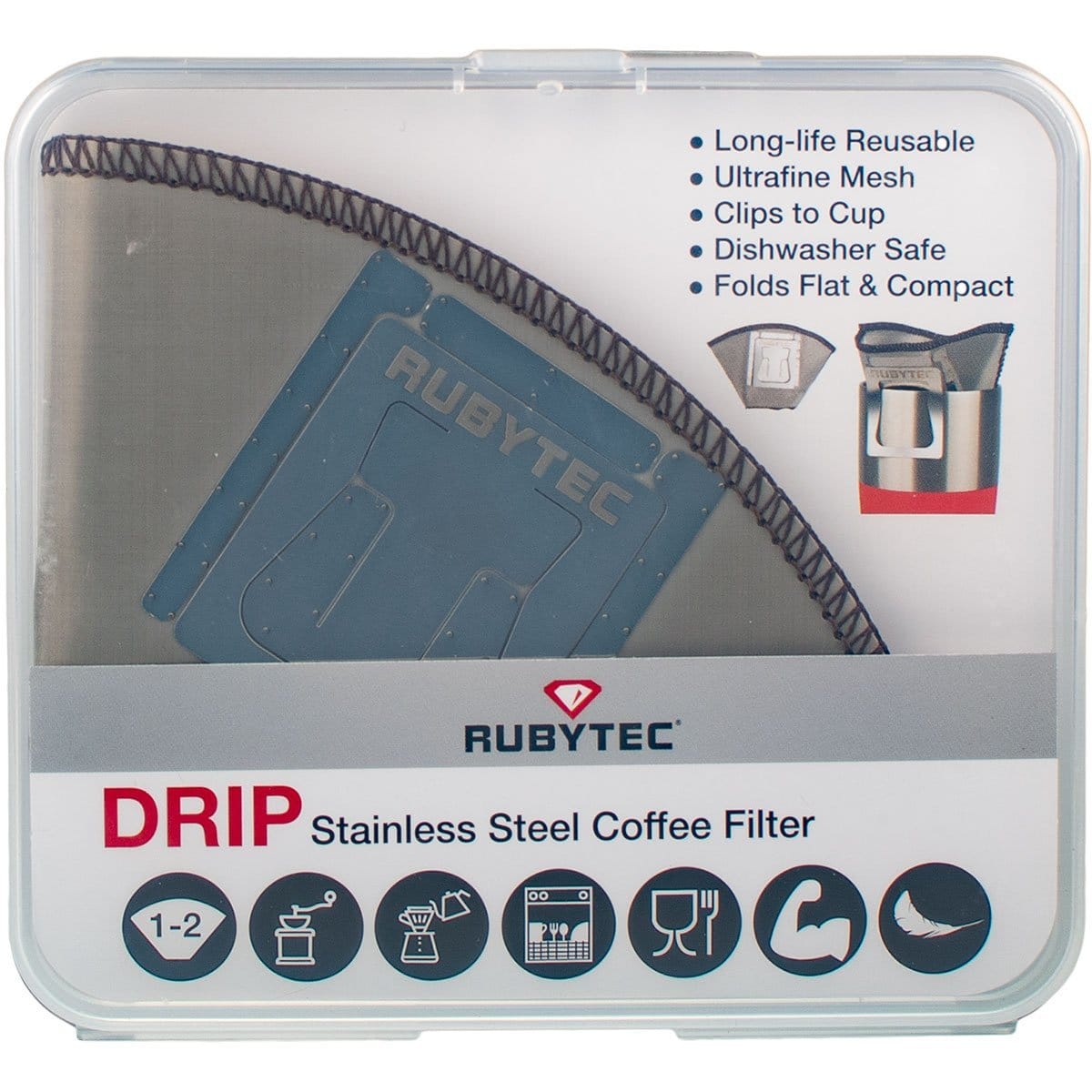 De Rubytec Drip is de ultieme herbruikbare koffiefilter. Het ultrafijne mesh is speciaal ontworpen om de langzame druppel overstroomstijl van een high-end Japans of Nederlands koffiefilter te evenaren. Het produceert een vrij schone, heldere kop en laat nog steeds een klein beetje olie door voor een rondere smaak in vergelijking met hoogwaardige papieren filters. Gemaakt van duurzaam 18/8 roestvrijstaal, het geeft geen smaak af, is voedselveilig, roestvrij en gemakkelijk te reinigen met de hand of in een vaatwasser. Kan ook worden gebruikt voor thee of kruiden. Een opbergbox is inbegrepen.